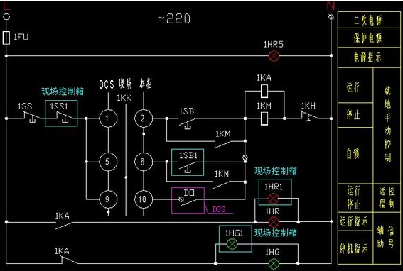為便于大家理解,下圖是GGD電氣柜、現場(chǎng)操作箱和DCS系統三地控制的電氣二次控制原理圖